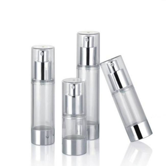 زجاجة المضخة هذه بدون هواء مع مضخة كريم ألومنيوم مع مشغل ألومنيوم. القطر الخارجي لهذه الزجاجة 33 ملم في 15 مل و 30 مل و 40 مل و 50 مل. مثالي للمصل والكريم والمستحلب.